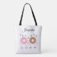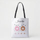 Hora de ir comprar no mercado! Compre com um sorriso na sua cara, enquanto essas rosquinhas dançantes ficam ao seu lado, esperando carregar suas compras e outros produtos. Estas rosquinhas são tão bonitas! Você pode mudar a cor da bolsa de tote e a cor, o estilo e o tamanho das letras. Personalizável. Trabalho original; © Sharon Lee Hudson. Todos os direitos reservados.