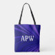Esta bolsa de tote monograma tem letras brancas sobre fundo roxo e preto. Você pode personalizá-lo com suas iniciais.