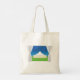 Vista pela janela de uma grande tenda branca sobre grama verde. Este design parece realmente eficaz nesta Tote Bag