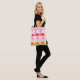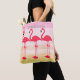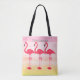 Crie um saco de tote flamingo rosa personalizado adicione seu próprio nome ou texto para personalizá-lo em faixas de chique em tons de rosa e amarelo em todo o impressão.