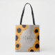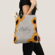 Na moda burlap tote bag bag com design de girassol amarelo radiante e o seu nome na caligrafia elegante fora de preto. Desenvolvido exclusivamente para você pelo Happy Dolphin Studio. Se precisar de ajuda ou produtos correspondentes, entre em contato conosco em happydolphinstudio@outlook.com