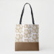 Esta bolsa de tote é mostrada com um design de impressão de flores tropicais bonitinho em uma cor de Ouro em tom de bronzeado com uma tira de sotaque castanho na parte inferior. Tamanho médio mostrado. Tem pulseiras negras. Personalize este item ou comprar como está.