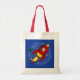 Ilustração de um foguete giro no espaço, rodeado por estrelas e uma pequena espaçonave verde. Também corresponde ao: