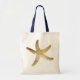 Um bolsa branco com uma imagem impressa de uma estrela do mar do ouro e dos punhos dos azuis marinhos.