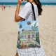 Leve o estilo ensolarado para onde quer que vá com esta cabana de praia vibrante. Mostrando uma cabana verde de espuma do mar, pranchas de surfe e palmeiras balançando, este carrinho costeiro traz vibrações de praia para sua rotina diária. Perfeito para dias de praia, corridas de mercado, ou como um saco para amantes do oceano que querem carregar um pouco da costa com eles.