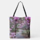 Sua escolha de bolsa de na moda ou de corpo cruzado com um impressão que mostra a foto de um jardim botânico com um caminho alinhado com lindas flores rosas de rododendron, junto com uma citação inspiradora e motivacional que diz: "Siga seus sonhos." Um design floral adorável! Selecione o estilo e o tamanho da sua bolsa.