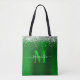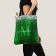 Crie sua própria bolsa de compras de monograma personalizado por mulheres para o feriado de Natal. Folha fina colorida verde esmeralda com gradiente verde verde e gráfico digital brilhante prateado. Monograma contemporâneo verde-claro e branco com design de caligrafia elegante estilo de assinatura. Você pode personalizar e alterar o estilo ou a cor da fonte conforme preferir. Todos os efeitos brilhantes e brilhantes do cetim vão ser impressão como uma foto no seu presente.