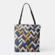 Formas geométricas sobrepostas em azul marinho, branco e amarelo mostarda, criando um saco de tote de padrão diagonal repetitivo