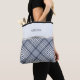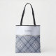 Elevate your everyday carry with this chic addition to our "Modern Plaid Boutique" collection. This high-quality tote bag features a contemporary "Milky Blue" and charcoal gray diagonal plaid pattern, designed for the woman who values both functionality and a coordinated aesthetic. The top half of the bag offers a clean, solid milky blue field personalized with your name in a timeless serif font, separated from the plaid base by a decorative silver-tone accent line. Whether you're heading to the farmer's market, using it as a boutique-style gift bag for the Mother of the Bride, or carrying your travel essentials, this tote combines durability with high-end designer appeal. Simply customize with your name to create a stylish, bespoke accessory that is uniquely yours.
