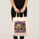 Saco de tota de mercearia com flor de árvore branca e roxa - a primavera é uma atitude para com