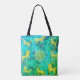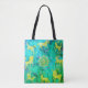 A colorful scene that is a rendition of some of the zodiac signs, in green and gold, is on the front and back of this tote bag.