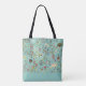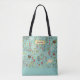Tão Whimsy tote bag, colorido e divertido, mostra pássaros, e muitas videiras e flores de coral, castanho escuro, creme, e verde sobre um fundo azul pálido. Você pode adicionar seu nome para personalizar este saco bonito!