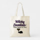 Um saco de tote adorável, ideal para sua bruxa amigável. Um design divertido com um gato preto no estilo retrô, com grandes olhos amarelos sentados sob o escrevendo brutal. Acima do gato, em uma fonte roxa, com um contorno preto, estão as palavras, "Witchy Essentials" e abaixo que estão as palavras, "Poções, Cristais, Tratamentos de Gato" em um texto preto.