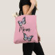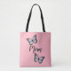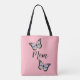 A bolsa de tote rosa tem duas belas borboletas voando em volta da palavra 'mãe' em roteiro preto.