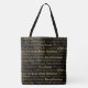 Padrão de Tipografia de Natal Trendy Dourado e Black Tote Bag. Disponível em dois tamanhos e estilos. A cor de fundo é preta, com um padrão de tipografia colorida de folha de ouro falsa. Felizes Férias, Feliz Natal e Saudações de Estação escritas em uma variedade de estilos de fontes. Design em ambos os lados do saco de tote. Bela, moderna e moderna ideia de presente de Natal.