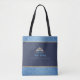 Este saco de tota é mostrado em azul de duas tonalidades. Banda brilhante azul escura e dourada, na parte superior e inferior, com alças pretas. Sapphire Blue bag e de ambos os lados é uma coroa atraente com pedras azul-escas. O texto de exemplo diz "Miss Kent Valley Rodeo Queen 2019". Personalize este saco ou comprar de tote conforme projetado.