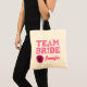 Saco de tote de canvas de festa de casamento divertida com gráfico cor-de-rosa a ler o Team Bride. O texto de script rosa personalizado, na parte inferior, está pronto para personalizar toda a festa noiva. Gráficos digitais de rosa-rosa florescem na parte inferior esquerda. Perfeito por segurar todas as coisas importantes que os membros do partido noivo não podem esquecer.