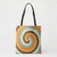 Esta imagem apresenta um padrão espiral ousado e colorido com faixas alternadas de turquesa, creme, laranja, amarelo e marrom. O movimento giratório dá uma sensação de movimento dinâmico, enquanto a paleta retrorcolorida evoca uma víbora nostálgica e vintage que lembra a década de 1970