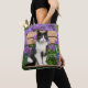 Bolsa Tote Tuxedo gato sentado numa cadeira de jardim com flo