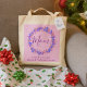 Um presente bonito para a mãe, esta bolsa de tote apresenta uma coroa floral roxa e azul com "Mãe" escrita no meio usando uma grande fonte cursiva. O fundo é lavanda. Personalize o seu hoje! Texto floral: AMBilustrações http://www.etsy.com/shop/AMBillustrations/
