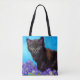Tote Bag com um gato e flores no estilo Van Gogh! Um gato preto se posou com flores roxas. Um presente perfeito para amantes de gatos e colecionadores de arte holandeses!