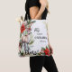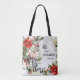 Saco de compras fofo com um design de aquarela com um cervo, flores festivas de Poinsettia de Natal e galhos de pinheiro e seus textos personalizados (engraçados ou outros). No verso, há um design vermelho e branco retrô elegante com listras e bolinhas. Você também pode copiar e colar a imagem da frente para trás, se desejar.