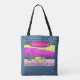 Uma carrinha de campismo, estacionada num campo com árvores e montanhas à distância. A cena pacífica foi transformada com um drama brilhante e colorido. Amarelo, fúcsia e rosas claro são as cores predominantes nesta vibrante obra de arte. Um fundo geométrico divertido, em azul lacrimogêneo e ouro, fornece o grande final. Um modelo para o seu nome, iniciais ou outro texto está acima da câmera retrorreflectora. O design é o mesmo na frente e na parte traseira desta viagem única bolsa.