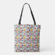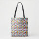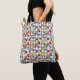 Esta bolsa de tote tem um design moderno do século médio de uma grade de linhas pretas com quadrados e retângulos em cores retrorativas em um campo de branco.