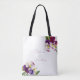 Esta bolsa romântica de guardas de casamento apresenta um design floral. O fundo é um branco simples e elegante com violetas de aquarela roxas. Um delicado buquê de flores violetas é uma figura no canto superior esquerdo, com os nomes do casal impresso abaixo.