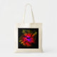 Um saco de tote com um fio abstrato colorido contra um fundo preto