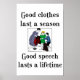 Boas roupas duram uma temporada, boa fala dura uma vida. Trabalho de arte de livros escolares de Vintage, na década de 1920, de uma mulher com dois filhos. Este ditado nostálgico ensina a importância da gramática inglesa.