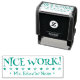 Este design de carimbo positivo apresenta a encorajadora mensagem "NICE WORK!" e um nome de tutor personalizado. Também apresenta formas decorativas de estrelas. Ele poderia ser usado por um professor de escola, educador ou orientador ao marcar trabalhos, para reconhecer que o aluno fez bem.