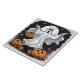 Um fantasma lúdico flutua sobre abóboras entalhadas sob uma lua de cheio, cercado por folhas de outono e por um céu escurecido, capturando a essência das festividades do Halloween.