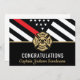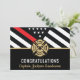 Este design apresenta uma bandeira de bombeiros com listras pretas e brancas, e uma fina faixa vermelha também. "Parabéns" e o crachá de bombeiro ficam acima do nome do bombeiro, tenente ou chefe graduado ou aposentado. Celebre em estilo!