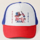 Aproveite as celebrações do dia da Independência com este chapéu patriótico. O design apresenta o tema Bandeira Americana com vermelho, branco e azul das cores do dia da Independência dos EUA, chapéu de festa e bebida fria. Vem com um Nome da Família personalizável. Perfeito para uma reunião patriótica de família.