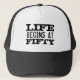 A vida começa no 50th chapéu engraçado do camionista do aniversário 50. Boné das citações do divertimento para homens e mulheres das pessoas de cinqüenta anos. Mude o ano da idade em conformidade. A tipografia desvanecida do vintage projeta com idade feita sob encomenda. Adicione seu próprio número feito sob encomenda. Refrigere a ideia do presente da festa de aniversário da surpresa para o pai legendário, o pai, o marido, o tio, o vovô, o irmão, o avô, o padrasto, o pensionista, o stepdad, o homem aposentado, o chefe, o headwear preto e branco do trabalhador etc. do co com letras afligidas do olhar. Humor específico à idade/sobre a piada do monte para caras das pessoas de cinqüenta anos. Modelo sujo para a fiftieth celebração do aniversário. Rotulação do estilo do Grunge. Customizável com suas próprias ideias cómicos do provérbio ou do slogan. Número de Personalizable para o 30o 40th 60th 80 Bday do 70!