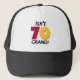 O design de texto preto, vermelho, e amarelo para o aniversário do 70 que lê "não é 70 grandes!".