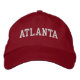Atlanta bordado branco sobre chapéu de algodão vermelho. Faz um presente maravilhoso para quem ama a Atlanta GA! Se preferir ter o seu texto pessoal, selecione simplesmente o botão "Personalizar este modelo" para introduzir o texto personalizado. O bordado também é personalizável para outras opções de cores selecionando o botão da ferramenta "Editar Design". Também está disponível a opção de selecionar essa cor na página do item principal.