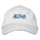 Chapéu de algodão bordado azul e branco ALOHA. Faz um presente maravilhoso para quem ama o Havaí! Se preferir ter o seu texto pessoal, selecione simplesmente o botão "Personalizar este modelo" para introduzir o texto personalizado. O bordado também é personalizável para outras opções de cores selecionando o botão da ferramenta "Editar Design". Também está disponível a opção de selecionar essa cor na página do item principal.