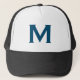 Trucker Hat personalizável e personalizado com um simples design de monograma azul. É um presente bem pensado.