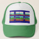 Chapéu de caminhoneiro com design azul que combina perfeitamente com a borda verde.