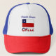 O boné de caminhoneiro apresenta a bandeira chilena com a palavra CHILE abaixo, nas cores da bandeira. Acima, um espaço para o seu nome em letras azuis para um visual legal ou um presente especial e personalizado. O boné de caminhoneiro fica ótimo em uma reunião de família.