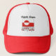 Greenlander Flag, a vermelho e branco, com a palavra GREENLAND, nas cores e nos motivos da bandeira. Acima é um local para adicionar um nome. Adicione seu nome para uma aparência personalizada neste chapéu de caminhoneiro. Adicione o nome de outra pessoa para personalizar um presente.