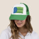 Trucker Hat com um design com a bandeira de Bellingham, Washington. Uma bandeira verde e azul