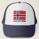 Bandeira norueguesa do chapéu feito sob encomenda do camionista de Noruega. O chapéu legal dos azuis marinhos por feriados do orgulho nacional, a política, o partido político e o evento de esportes internacional gostam do futebol. Adicione seu próprio citações ou slogan engraçado. Design escandinavo do orgulho.