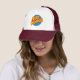 Chapéu de Beerwoman…. Chapéu da cerveja do divertimento para fãs desta bebida adulta. Super-herói-tipo pia batismal em amarelo e no vermelho. Um círculo azul está no fundo. Um boné groovy da mulher da cerveja.
