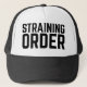 STRAINING ORDER diversão e slogan ousado no chapéu de caminhoneiro, preto, irônico, tipografia, declaração engraçada, inspirado pelo personagem de tv frank rossitano. restrição da ordem e da desordem. jogo de palavras inteligente e chapéu humorístico.