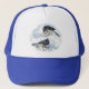 Este chapéu é decorado com dois Blue Jays colorido que risca na neve para que algo coma. As sombras azuis formam um teste padrão bonito no fundo.