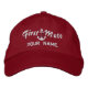 Um boné personalizado dinâmico de Primeira Companhia, no estilo náutico vermelho e branco, bordado que certamente fará uma impressão sobre ou fora do barco. Torne este bordado de design de âncora de estrela tão único quanto você com seu nome, sua localização ou o nome do seu barco.