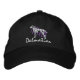 O chapéu Dalmaciano moderno tem uma silhueta de cão em frente a um rabisco roxo, e o nome da raça está escrito abaixo. Excelente bordado de amante de animais!